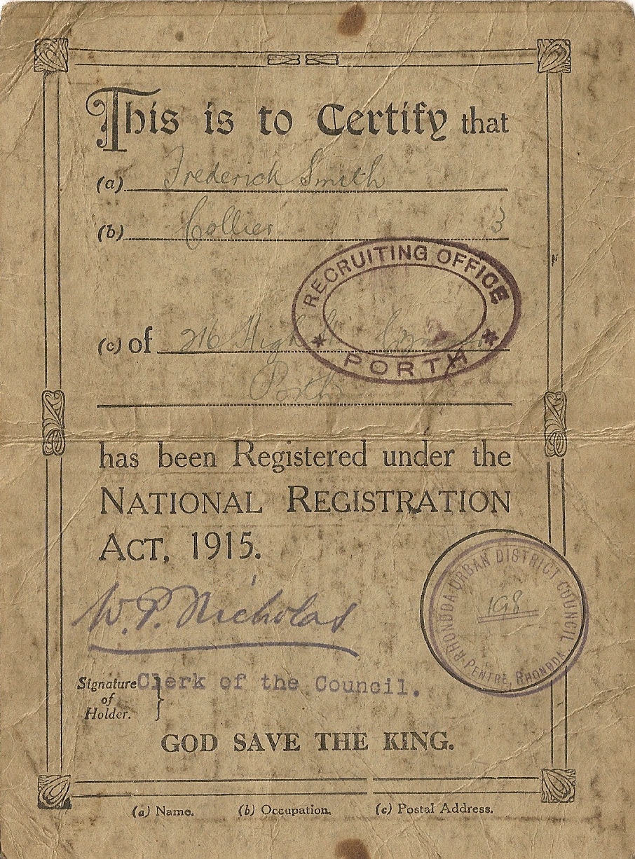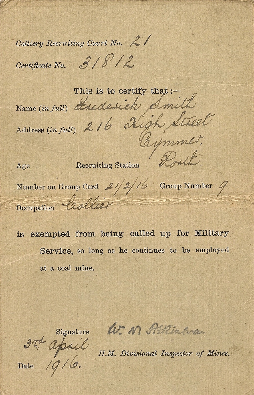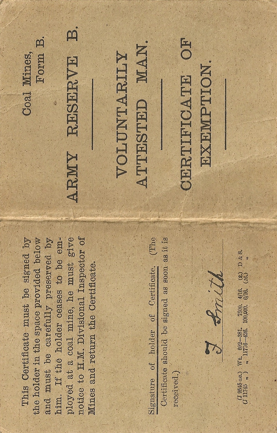 With all the searching I’ve been doing for my great-grandfathers who did serve in the war I almost forget about those that didn’t. My great-grandfather, Frederick Smith, was a collier, and as such was exempt from service. As luck would have it my father actually gave me my great-grandfather’s exemption cards and I filed them away some years ago and haven’t seen them since. Pieces of history like this often get overlooked so I thought it was important to bring it up, and have included images of the cards below.