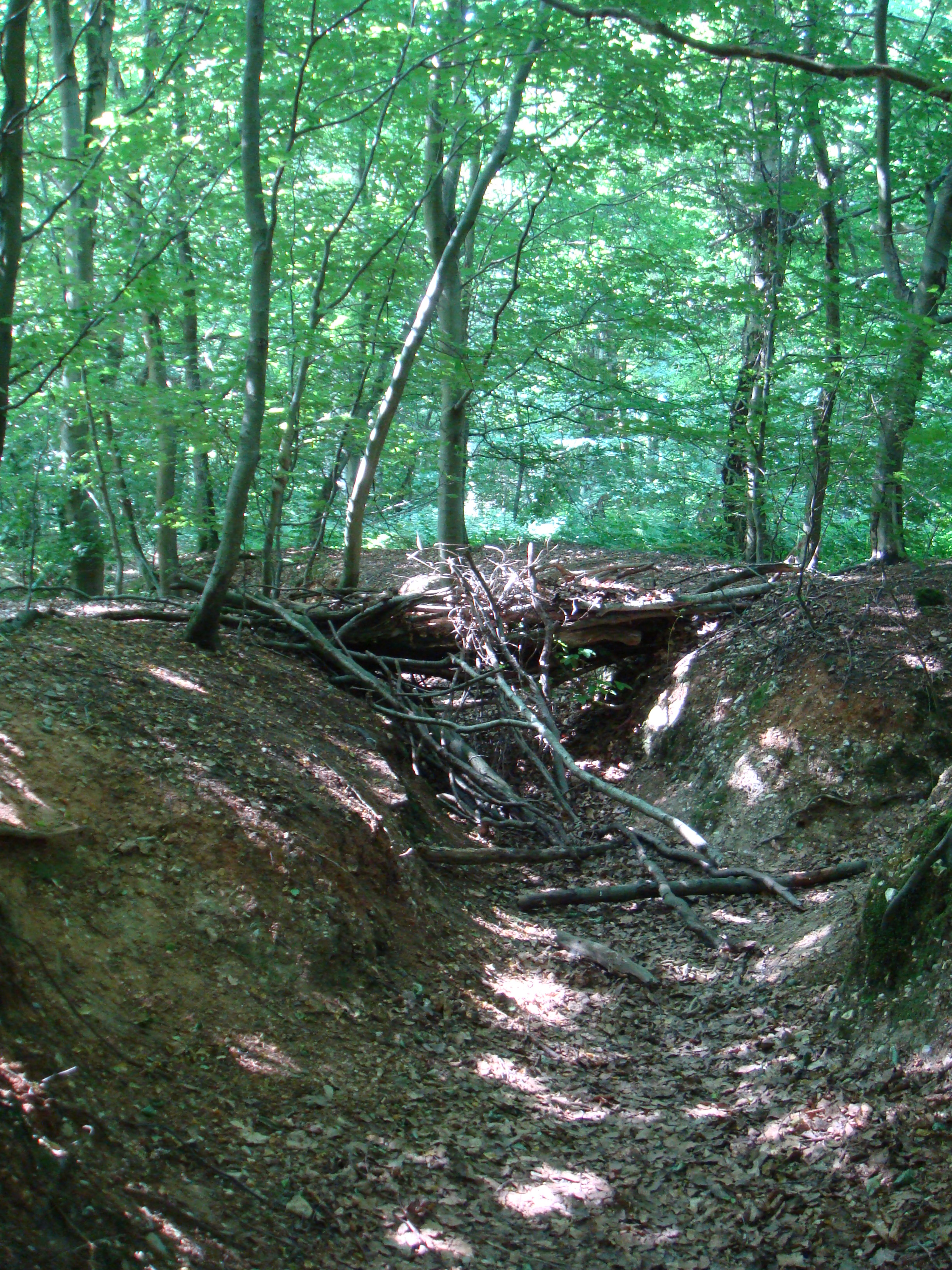 You might think that these trenches are forgotten but more than a few people are still using them. We saw dog walkers and cyclists. The local archaeology group have done a great report on the place which you can see here. The trenches are also filled with the remnants of kids at play. We found bike marks, rope swings, and more than a couple of forts.
