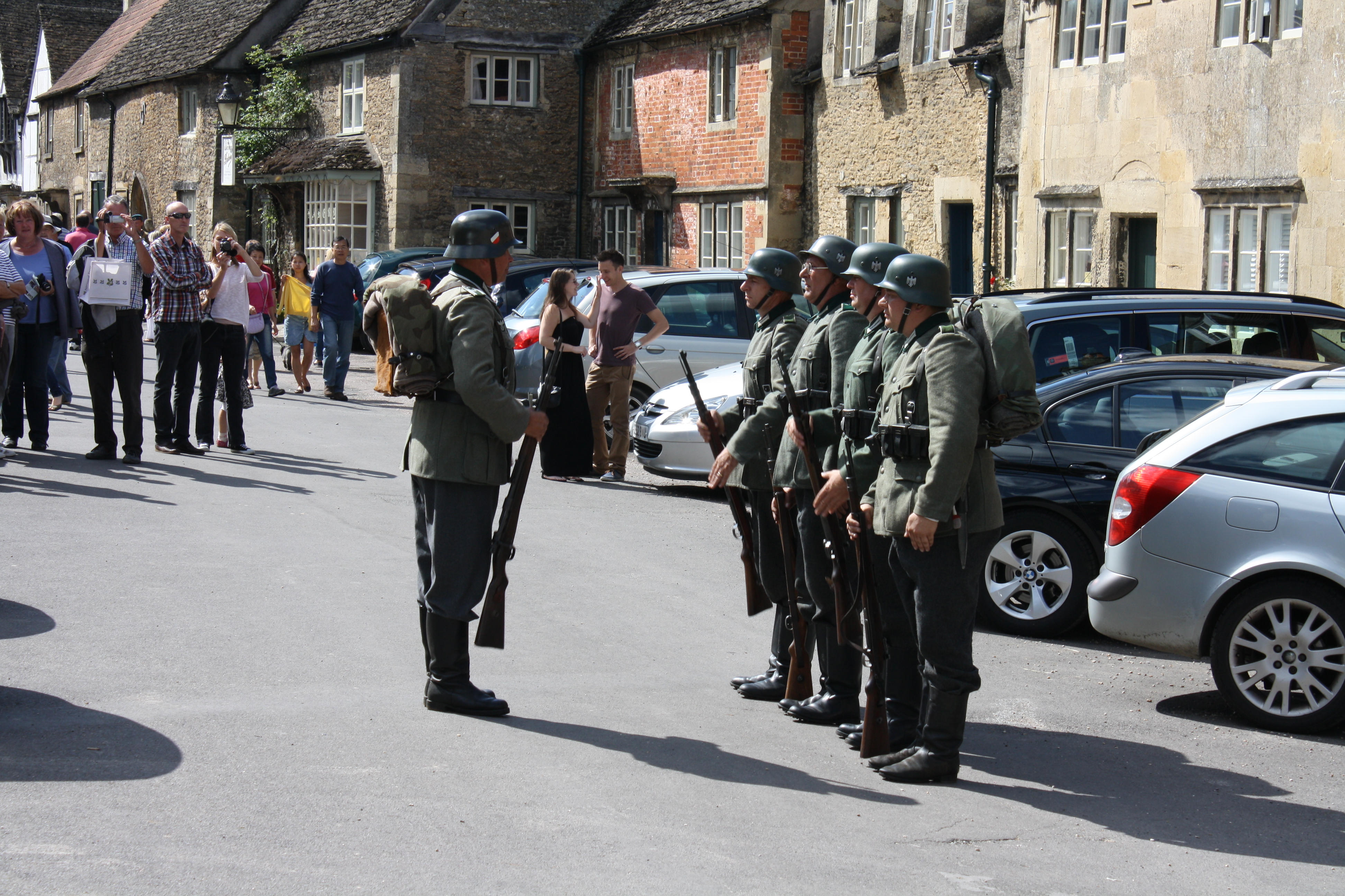 Lacock is a quiet town but the organisers had made an effort to spread the reenactors around. A platoon of soldiers marched the streets, stopping occasionally to reposition their rifles. We couldn’t figure out which nationality these soldiers were. They had flags on their helmets, something I haven’t seen before, which at the time we thought were German, but on closer inspection appear to the flag of Rome. However, they were wearing German uniform, and as far as we could make out were speaking Polish. Obviously a niche soldier, most likely an army of another nationality fighting for the Germans. (If you can work it out, please let me know.)